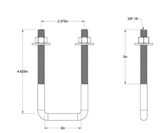 Pack of 4 - Sq U-Bolt Zinc-Plated Steel, 3/8"-16 Thread, 2" Inside W, 4-5/8" H